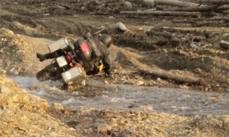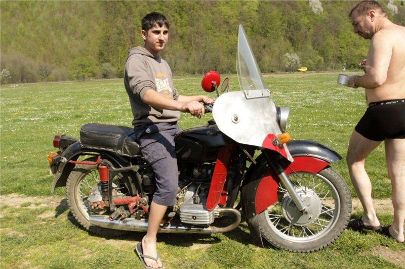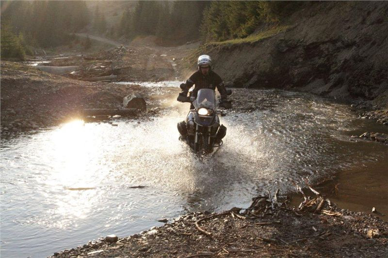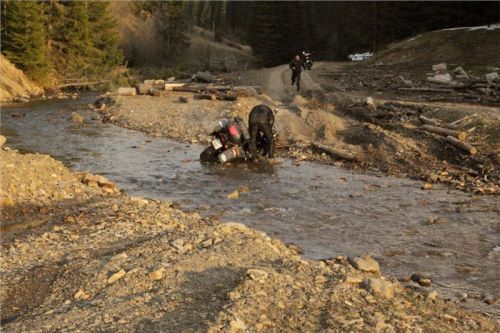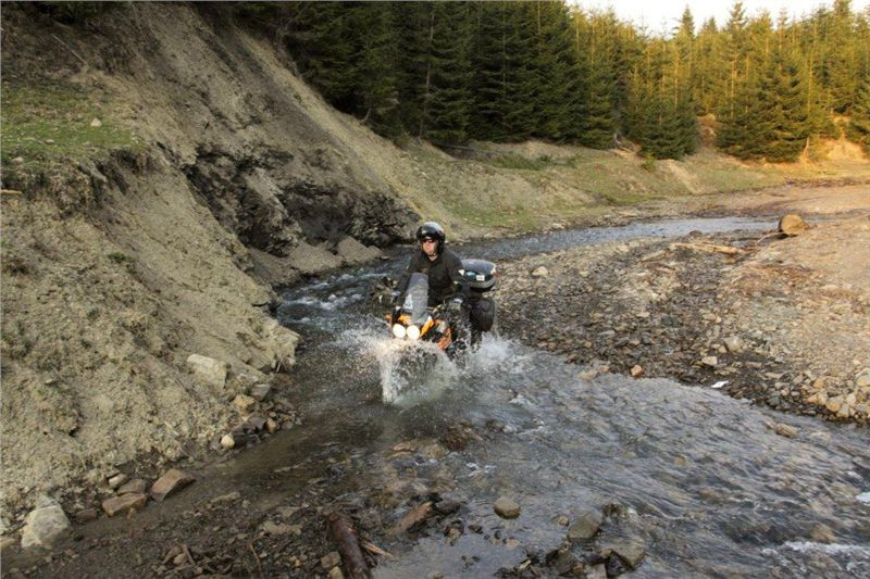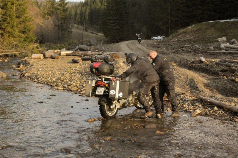Po obědě pokračujeme přes děrevňu Sloboda, kterou projíždíme skrz až kam se dá, hory, doly, brody, kde na jednom Tonda upadá (od té doby jezdí se šnorchlem). Blbneme jak malí kluci a zkoušíme prudké výjezdy a zase sjezdy, prostě nádhera. Když jsme z toho všeho již dostatečně unaveni, zajíždíme do 16 km vzdálené Kolčavy, kde ustájujeme motorky na dvorku bývalé četnické stanice. Zdravíme se s majitelkou penzionu Natálkou, která si nás pamatuje ještě od loňské návštěvy. Je pro nás připraveno pár piv a nějaký to místní ostrý pití. Nejdůležitější je však pro nás sprcha. Jsme příjemně unaveni, a tak usínáme spánkem spravedlivých. V noci pak ještě projíždíme všechna ta krásná místa, poloniny, prašné cesty, opuštěná údolí, hory a brody a…