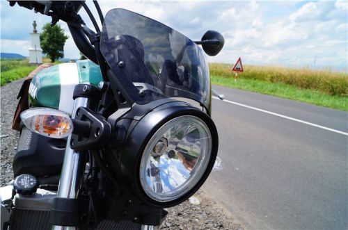 Pojďme si ji v bodech představit. 689 cm3 řadového dvouválce v ocelovém příhradovém rámu, s kulatým světlometem, nízkým štítkem a nádhernou zelenou metalízou s bílým racing proužkem. K docílení absolutního retro stylu v edici Faster Sons pomáhá i stylová kožená brašna s vlastním textilním krytem proti dešti. Obloha zatím jen oblačná, tak jedem.