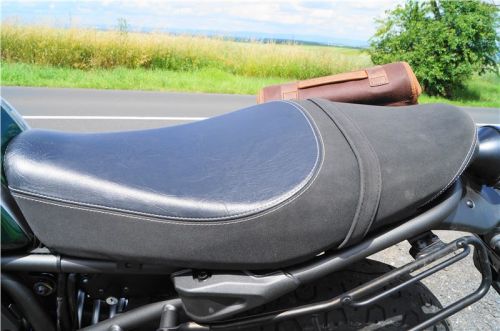 Vzhledem k záměru oslavit staré ikonické modely z let dávno minulých je k dokoupení připravena celá řada doplňků a příslušenství. Zde se musím zastavit u hnědé kožené brašny Sport Heritage, kterou jsem měl k dispozici a jež spolu s brašnou na nářadí a na nádrž tvoří ucelenou „imidžovku“. Brašna se pomocí klíčku velice snadno připne vedle sedla a je kromě nepromoku vybavena také popruhem na rameno k samostatnému nošení třeba po městě.